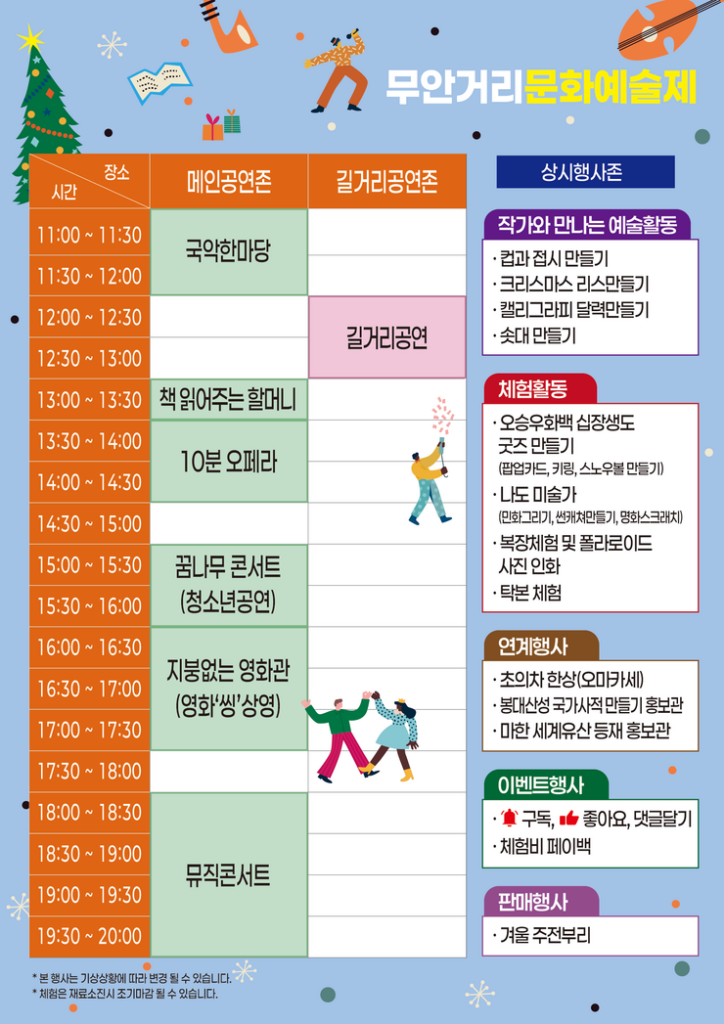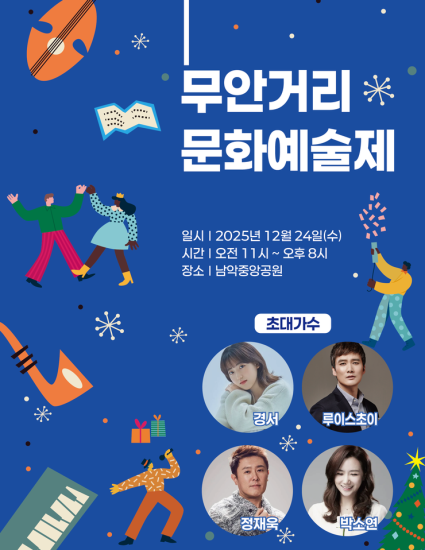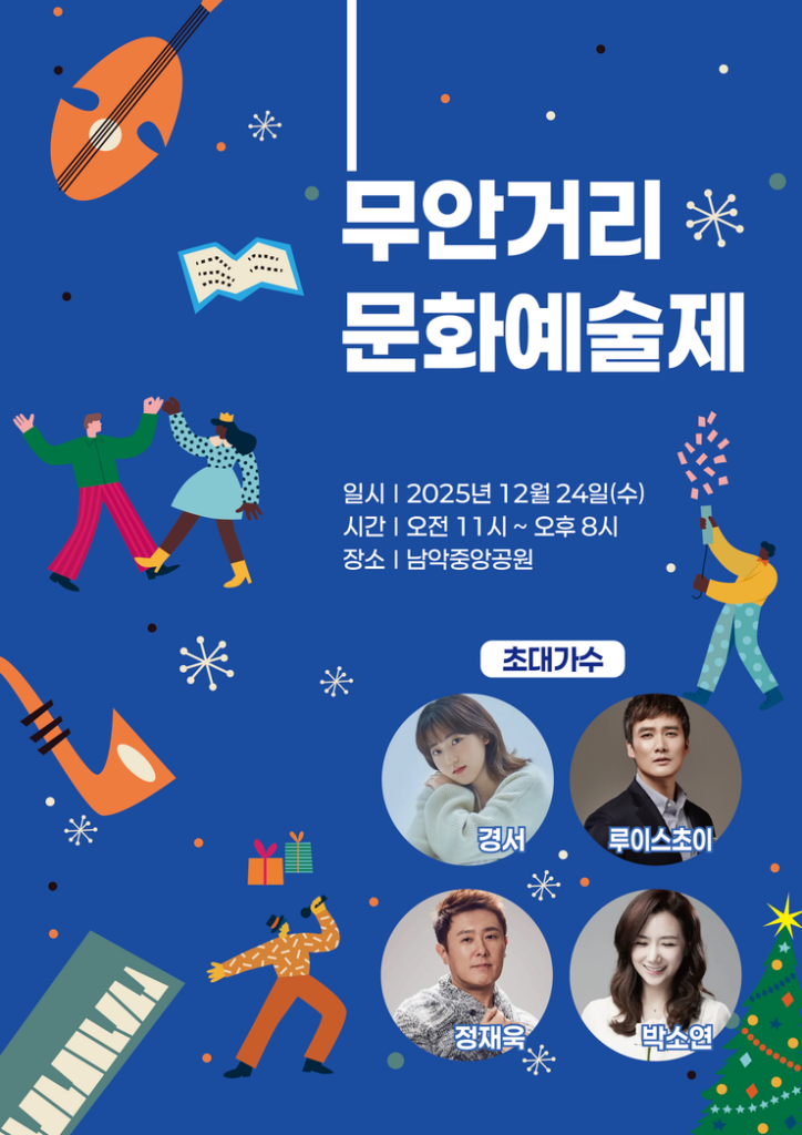 2025 무안거리문화예술제가 2025년 12월 24실 10시부터 20시까지 남악중앙공원 일원에서 개최합니다.