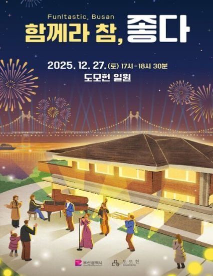 부산시(시장 박형준)는 오는 12월 27일 오후 4시 30분, 시민을 위한 열린 복합문화공간 도모헌(구 시장관사) 다할 강연장에서 시민 누구나 함께 즐길 수 있는 연말 콘서트 ‘함께라 참, 좋다 펀!타스틱 부산(Fun!tastic Busan)’을 개최한다고 밝혔다.