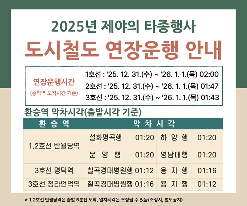 한편, 행사 당일 밤 10시 30분부터 다음날 01시 30까지 동인네거리~삼덕네거리, 공평네거리~동신교 서편 구간이 전면 통제된다. 행사장 인근을 통과하는 시내버스 18개 노선*은 밤 10시 30분 이후 행사장을 우회 운행하고, 직행 1개 노선과 급행 4개 노선**은 새벽 1시경 시내를 통과한다. 도시철도는 반월당역과 명덕역을 다음날 01시 10분경 통과하도록 연장 운행해 시민들의 안전한 귀가를 도울 계획이다.