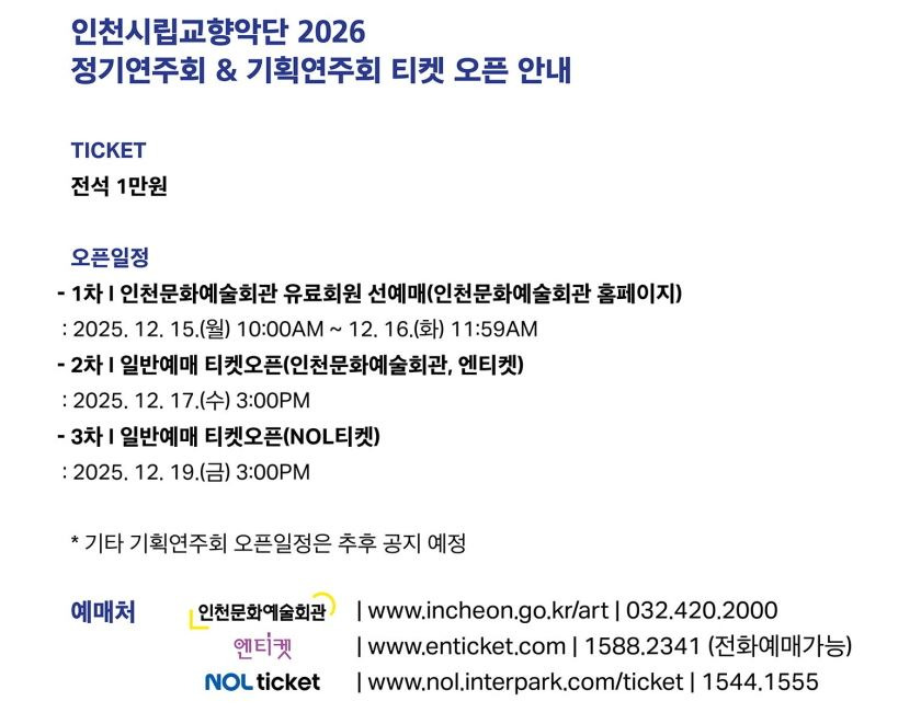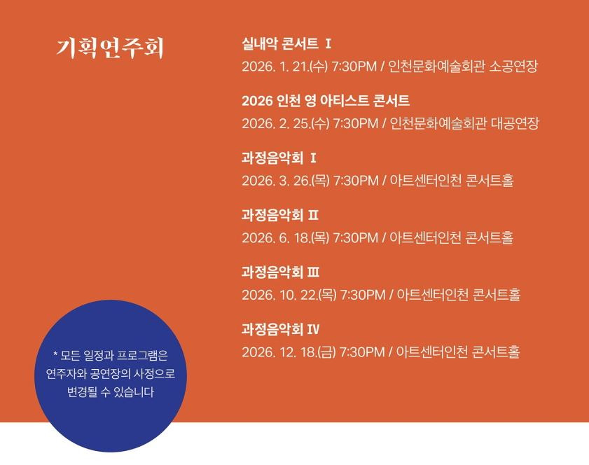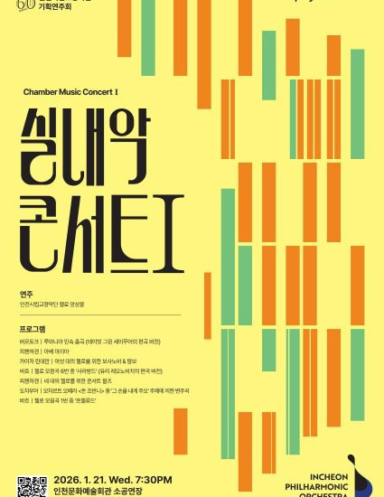 1966년 창단된 인천시립교향악단은 풀 오케스트라 연주뿐 아니라 현악 체임버 오케스트라, 목관·금관 앙상블 등 다양한 편성을 통해 폭넓은 음악 활동을 이어오고 있다. 2026년 역시 총 세 차례의 실내악 콘서트를 마련해, 완성도 높은 연주로 체임버 음악의 매력을 꾸준히 소개할 계획이다.