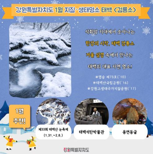 석회암 지대에서 지하수가 용출하는 카르스트 샘, 한강의 발원지로 이어지는 고요한 풍경, 그리고 설경 속 태백산의 맑은 공기까지 겨울 태백이 품은 자연의 깊이를 직접 느껴보세요.