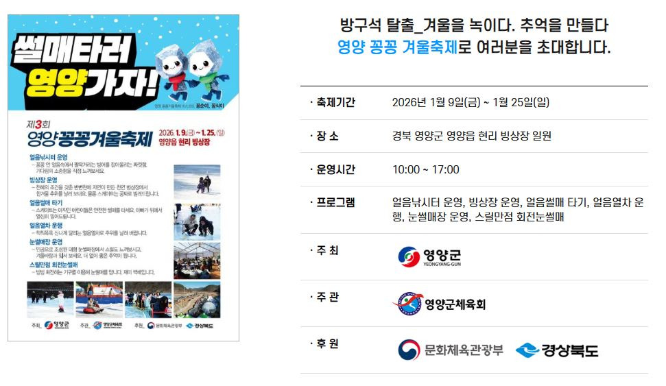 경북 영양군 영양읍 현리 674-1번지 빙상장 일원에서 개최되는 영양군의 대표적 겨울축제인 영양꽁꽁겨울축제가 2026년 1월 9일부터 25일까지 개최합니다.
