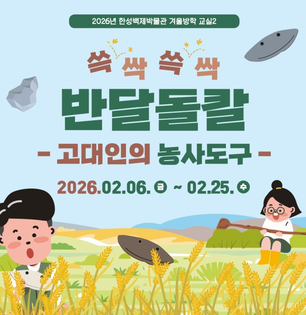 한성백제박물관(관장 김지연)은 겨울방학을 맞아 초등학생 자녀를 둔 가족을 대상으로 2월 6일(금)부터 25일(수)까지 ‘2026년 겨울방학교실2 <쓱싹쓱싹 반달돌칼:고대인의 농사도구>’를 운영한다. 고대 사회의 생활상과 농경 문화를 쉽고 흥미롭게 이해할 수 있는 프로그램이다.