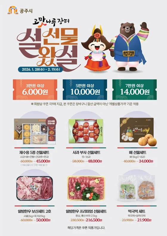 이번 기획전에서는 사과, 배, 깐밤, 한과, 건대추로 구성한 ‘제수용 5종 선물세트’를 비롯해 공주알밤 한우세트, 사과, 배 등 고맛나루장터에 입점한 다양한 상품을 선보인다. 행사 기간에 구매하면 품목별로 최대 3만 원 상당의 할인 혜택을 받을 수 있다.
